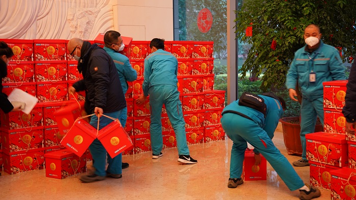 兔年將至,備年禮、囤年貨都是必不可少的儀式。一件件代表著公司關懷的年貨堆成一座座小山,承載了公司對每一位員工真摯的問候與祝福,紅色的包裝更為發年貨現場增添了喜慶、熱鬧的氛圍感。