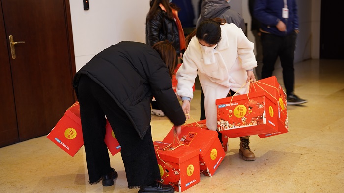 在所有年貨到位之后,各公司員工來到一樓大廳,滿懷激動的心情領取年貨。“快快快,點一下。”“你幫忙多拿幾個,一起上去!”“這個不錯,我喜歡吃。”年貨發放現場氣氛熱烈,大家提著沉甸甸的年貨,臉上洋溢著笑容,新春佳節的喜悅已縈繞在公司內外。