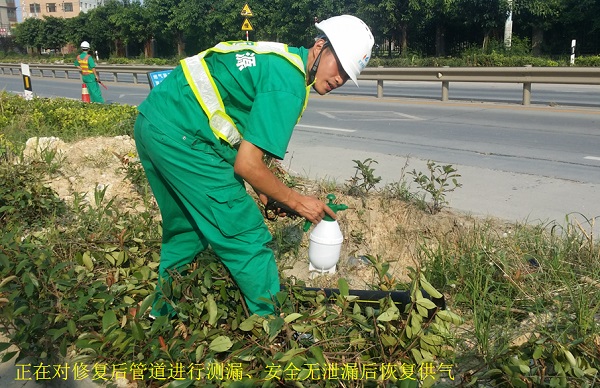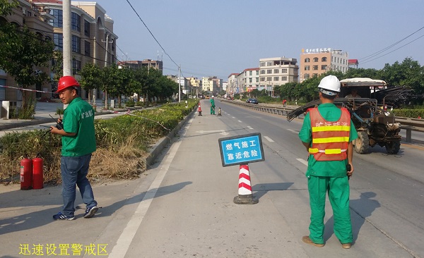 本次演練項目為:天然氣管道被第三方施工單位挖破后大量泄漏的應急處置。主要流程為:模擬事故發生、報警、應急啟動、人員疏散、安全警戒及交通管制、關閉上下游管道閥門、驅散泄漏燃氣、破損管道搶修、解除警戒、恢復供氣等。在演練過程中,所有參演人員嚴肅認真、節奏緊湊而又有條不紊地進行各個演練步驟,歷時近50分鐘后,演練圓滿完成。