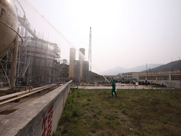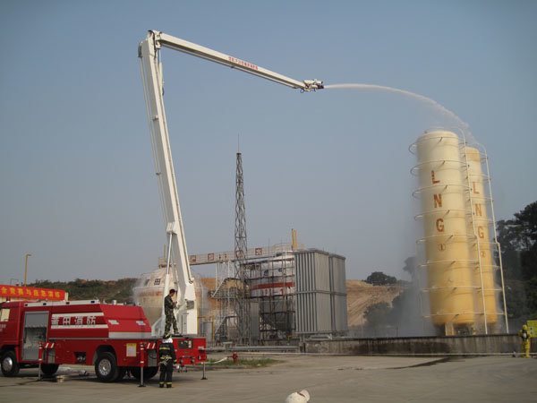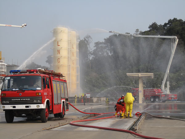 15:30分,隨著生產部報警聲響起,LNG灌區發生泄漏,現場指揮接警后立即按響報警器,指揮相關小組啟動消防水泵,對灌區進行緊急噴淋,隔離相鄰儲罐,并組織員工按預定區域到達避難位置。市消防派出2輛高噴消防車、6輛水罐消防車到達起火現場,火情偵檢組隨即展開偵檢,先用泄露儀對現場進行濃度檢測,并用隔離帶劃出相應的警戒線,保安配合警戒組疏散區域內無關人員及在場使用中的車輛熄火,同時關閉大門,禁止除消防車、搶險車外的一切車輛出入。在得知了著火位置和泄漏程度后,中隊指揮員立即下令,展開滅火行動。消防隊員穿上消防戰斗服、佩戴防毒面具和呼吸器、攜帶銅質工具和滅火器材迅速趕往事故儲罐,關閉儲罐根部所有閥門。而其余消防車按照預期指定位置,全方位對LNG灌體進行火災撲救。