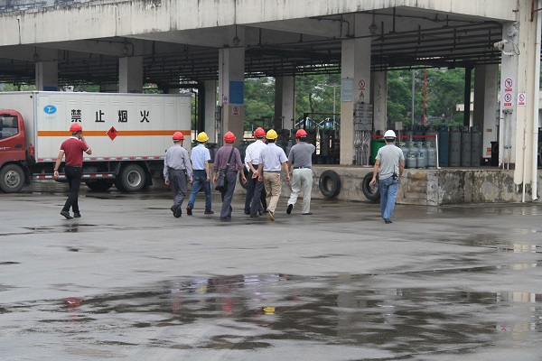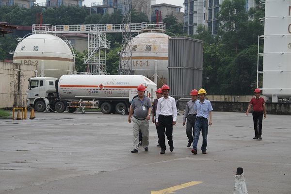 王明炫副廳長等領導一行首先來到曠遠能源氣源廠,詳細了解液化石油氣鋼瓶的充裝、運輸等一系列作業流程,現場詢問關于推行瓶裝液化石油氣銷售實名制的落實情況,并對實名制登記相關資料進行了檢查,。