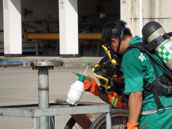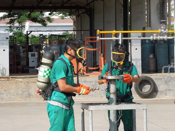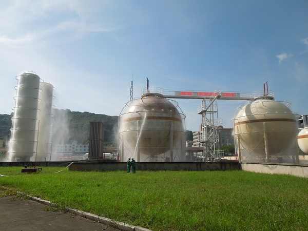 本次演練項目為:LPG1#儲罐底部出口閥被恐怖分子破壞造成液化石油氣泄漏事故的應急處置。主要流程為:模擬事故發生、制服歹徒、報警、應急啟動、人員疏散、安全警戒、消防噴淋驅散稀釋燃氣濃度、搶險堵漏及最終解除警戒等。在總指揮的領導下,所有參演人員嚴肅認真、有條不紊地進行各個演練步驟,歷時一個小時后,演練圓滿結束。